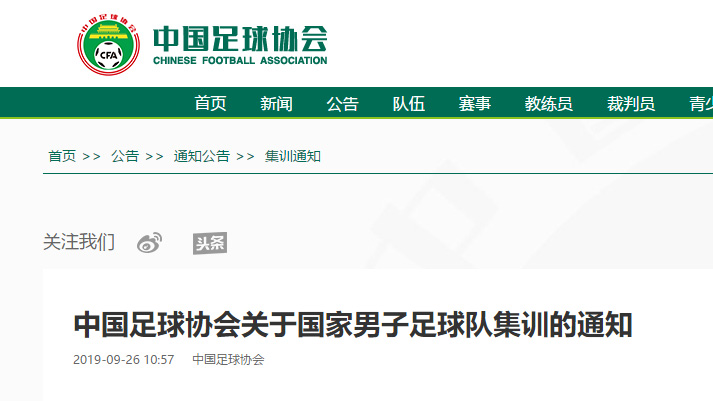 北京时间9月26日上午,中国足球协会官网发布通知,中国队将于2019年10月5日至16日期间赴广州市、菲律宾巴科洛德组织集训并参加世界杯亚洲区预选赛预赛阶段赛事。