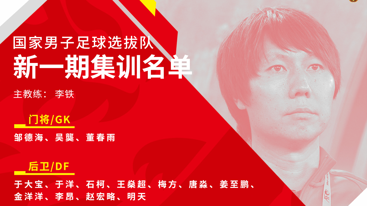 北京时间10月31日,中国足球协会宣布组建国家男足选拔队,李铁担任主教练并率队参加将于12月10日至18日在韩国举行的2019年东亚足球锦标赛(EAFF E-1 Championship,简称东亚杯)。国家男足选拔队定于2019年11月3日至14日期间赴武汉市组织首期集训。