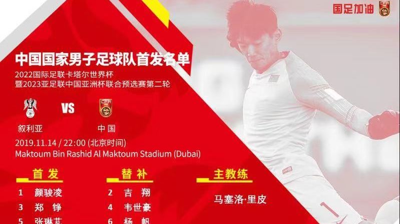 北京时间11月14日,2022国际足联卡塔尔世界杯暨2023亚足联中国亚洲杯联合预选赛第二轮中国队客场挑战叙利亚队的比赛即将在迪拜打响。中国国家男子足球队首发名单出炉。