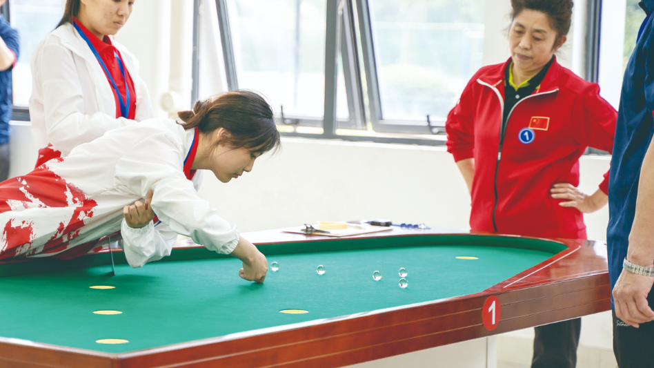 指弹球比赛,中石化胜利油田队冯胜利获得男子单人赛冠军,山东队刘红拿到女子单人赛冠军,男子双人赛冠军属于中石化胜利油田队,山东队拿到女子双人赛、团体赛第一名。