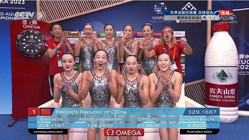 北京时间7月21日,福冈游泳世锦赛花样游泳集体自由自选决赛结束角逐,中国队凭借稳定出色的发挥,以总成绩329.1687分的绝对优势夺得冠军,这是中国花样游泳队在本届世锦赛收获的第2金,也是中国队在本届世锦赛的第13金。