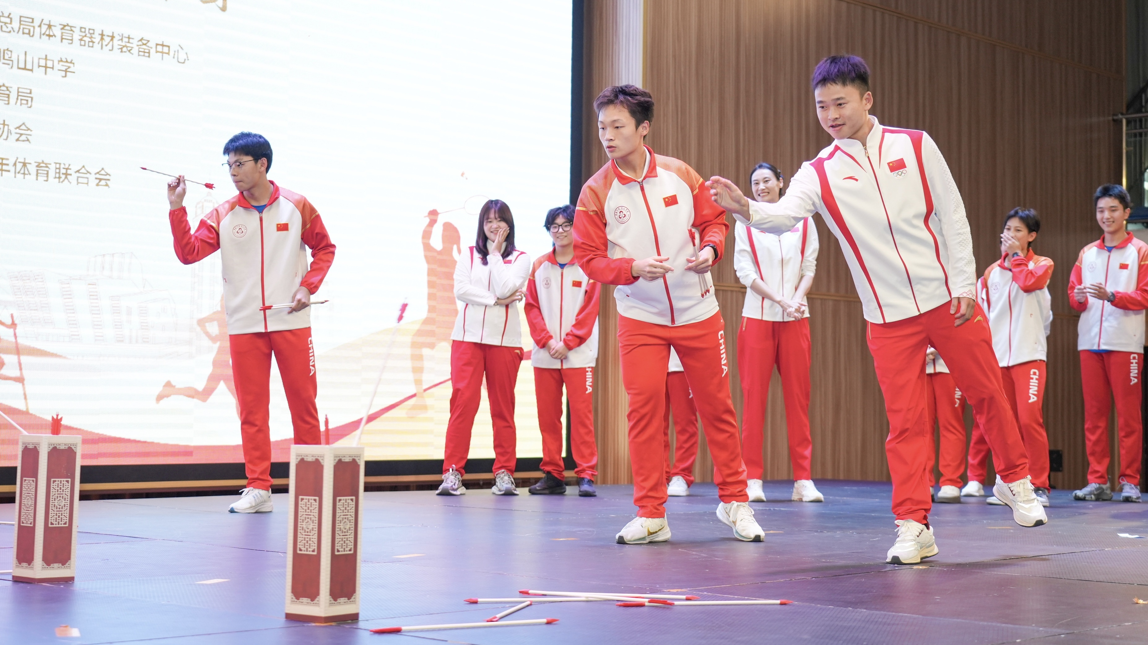 在“冠军大讲堂”环节中,谢瑜、张琼月分享了赛场中的难忘经历,鼓励同学们正确看待输赢,保持冷静和从容心态。凤鸣山中学校友许双双与队友李玲一起回顾了运动生涯的艰辛与荣耀,激励学弟学妹们克服困难,坚韧不拔。“放弃和坚持就在一瞬间,希望大家始终不忘初心”。张亚雯为同学们述说自己的体育梦想,并鼓励所有的青少年勇于挑战,追求卓越。运动员们的讲述不仅展现了不懈努力的拼搏精神和积极向上的心态,更鼓舞了同学们树立正确的价值观和人生目标,成为对社会有贡献的新时代青年。在随后的互动环节中,同学们踊跃参与,与运动员们分组进行投壶、闭眼单脚站和羽毛球趣味击球小游戏,考验了大家的精准性、灵敏度、耐力等体能素质与合作精神,现场加油声、欢笑声此起彼伏,运动员与师生们共同沉浸在体育带来的乐趣之中。