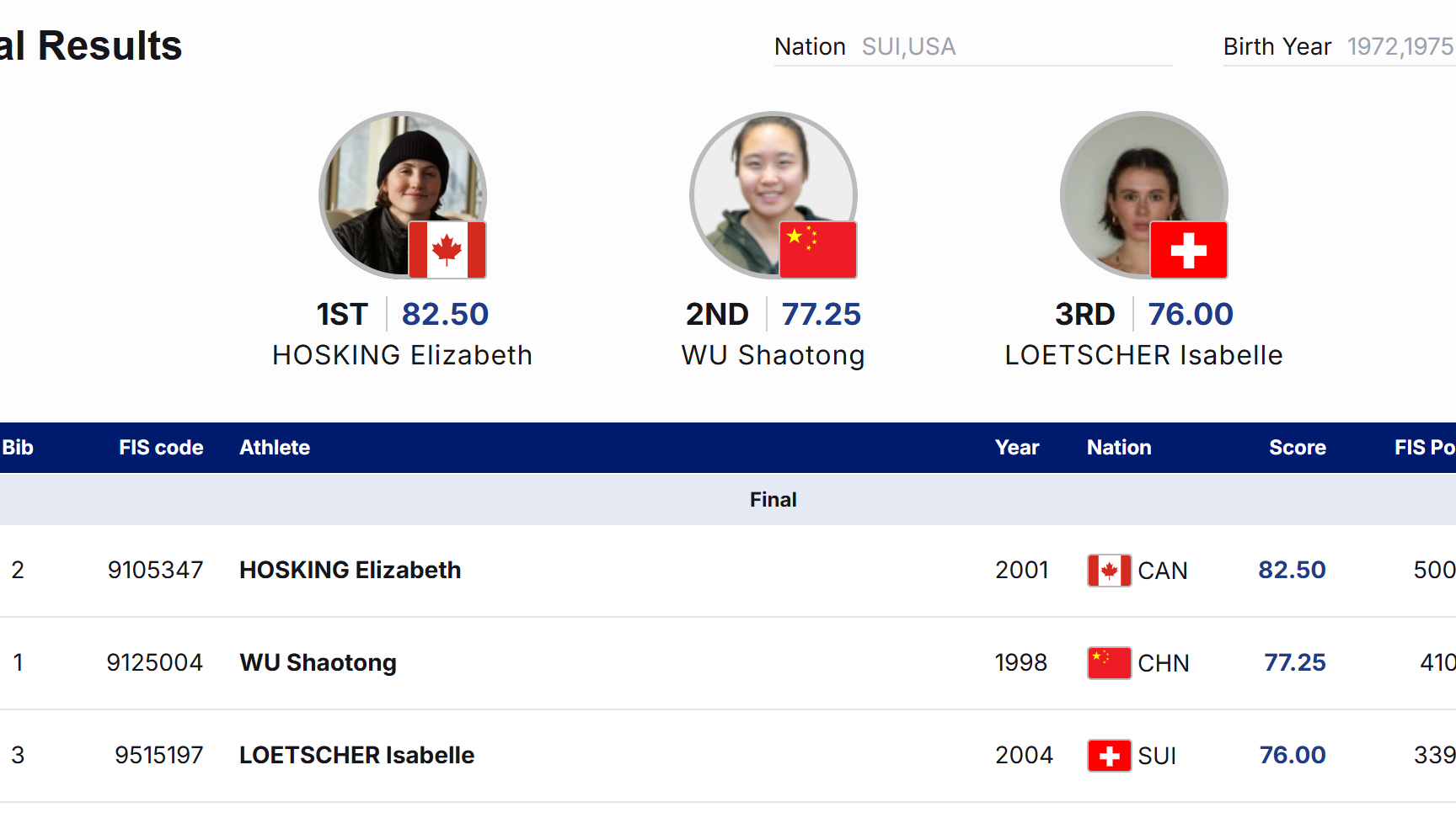 自由式滑雪U型场地技巧名将、中国选手谷爱凌,英国选手佐伊·阿特金等,单板滑雪U型场地技巧名将、美国选手克洛伊·金,日本选手清水沙罗、小野光希等,均缺席本站比赛。下一站U型场地技巧世界杯将在美国阿斯本举行,这将是米兰冬奥会前倒数第二站世界杯赛事。