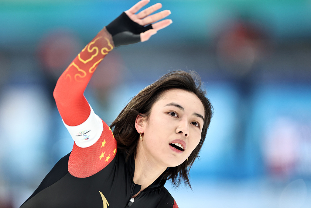 2月5日下午,北京冬奥会速度滑冰女子3000米在“冰丝带”展开较量,经过一番角逐,荷兰名将斯豪滕滑出3分56秒93,夺得冠军并创造新的奥运会纪录,中国选手韩梅和阿合娜尔·阿达克分列第15和第17位。图为阿合娜尔·阿达克在比赛中。(图片来源:中国体育图片)
