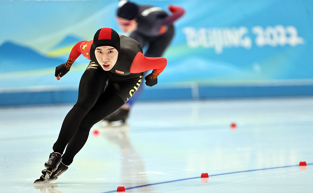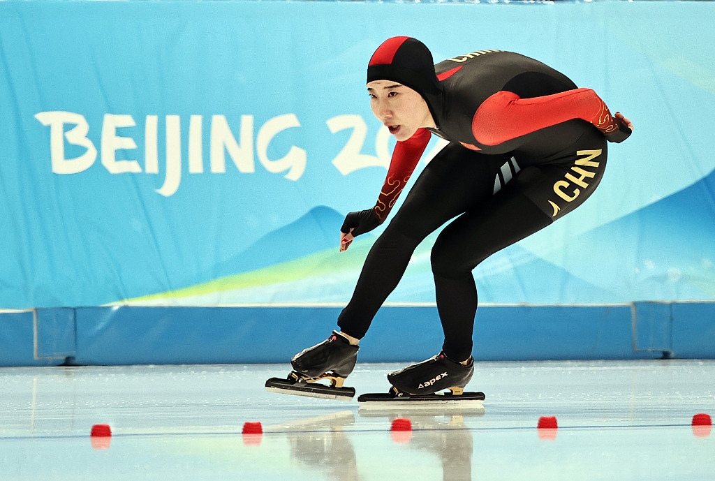 2月5日下午,北京冬奥会速度滑冰女子3000米在“冰丝带”展开较量,经过一番角逐,荷兰名将斯豪滕滑出3分56秒93,夺得冠军并创造新的奥运会纪录,中国选手韩梅和阿合娜尔·阿达克分列第15和第17位。图为韩梅在比赛中。(图片来源:中国体育图片)