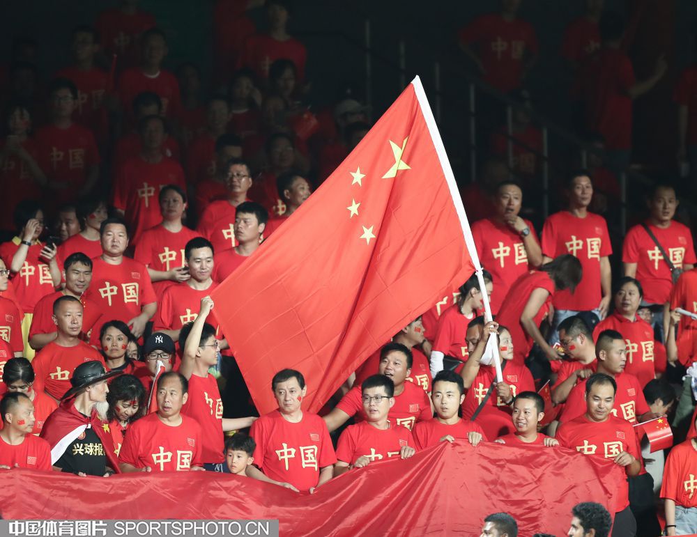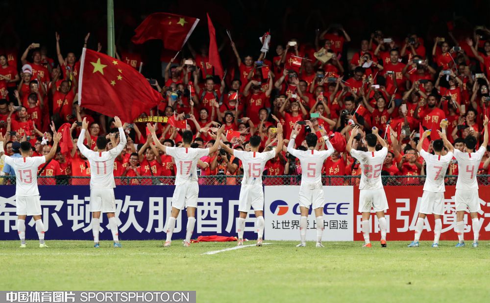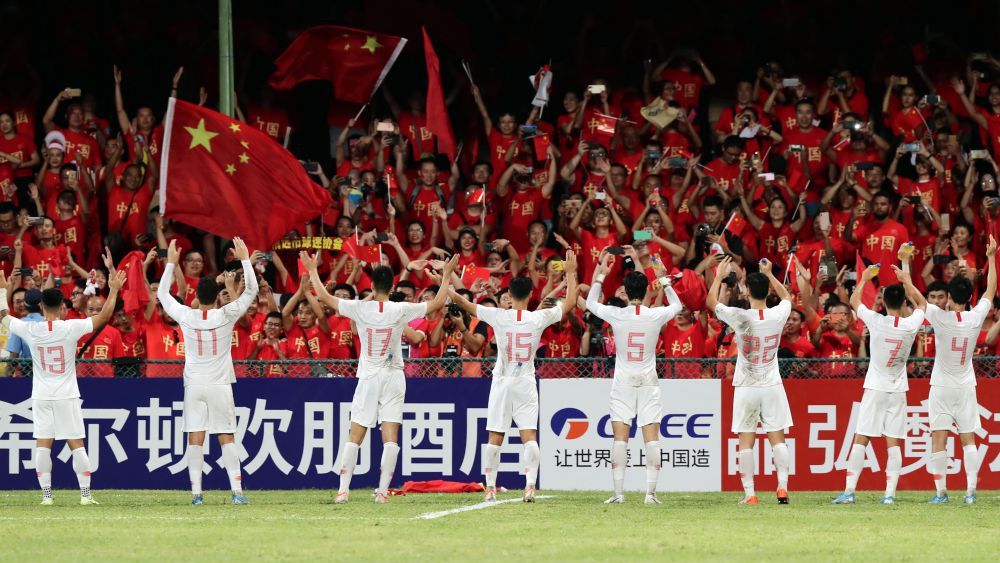 当地时间9月10日,2022年卡塔尔世界杯预选赛亚洲区40强赛中国队客战马尔代夫队的比赛在马尔代夫马累国家体育场举行。结果,中国队以5比0战胜对手,取得开门红。图为中国队赛后答谢现场的中国球迷。 (王宪民 摄)