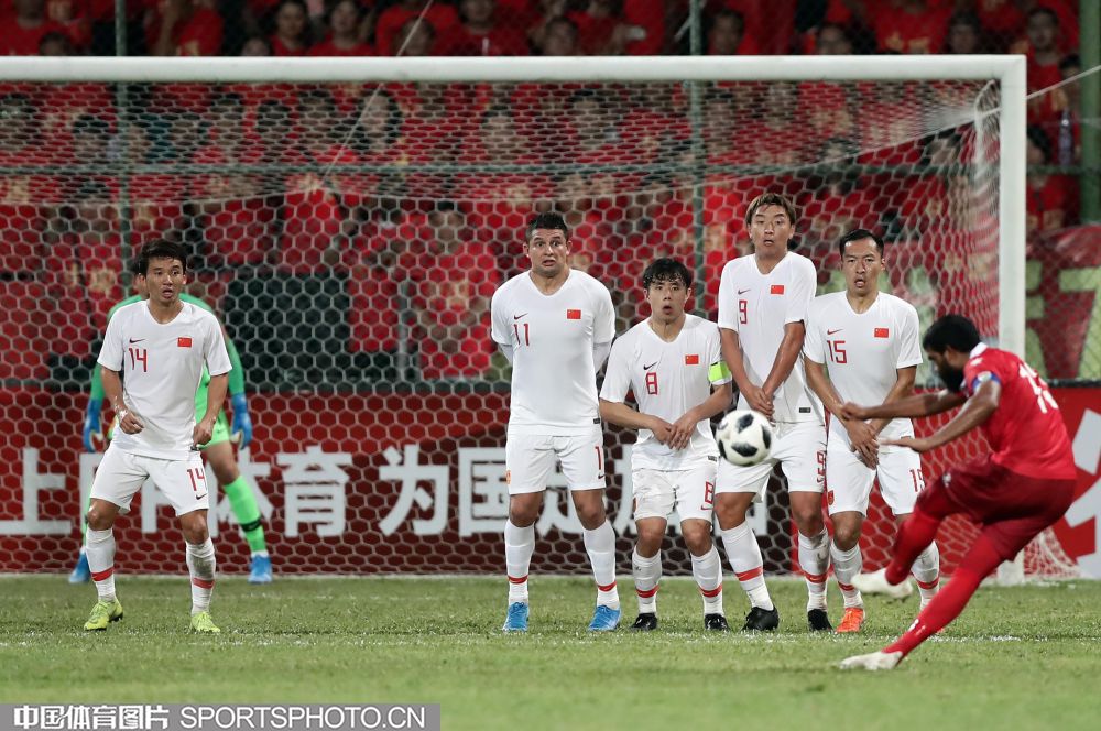 当地时间9月10日,2022年卡塔尔世界杯预选赛亚洲区40强赛中国队客战马尔代夫队的比赛在马尔代夫马累国家体育场举行。结果,中国队以5比0战胜对手,取得开门红。图为中国队排人墙防守直接任意球。 (王宪民 摄)