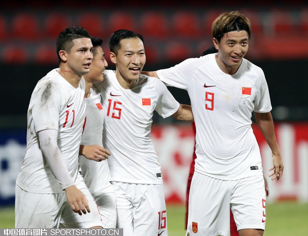 当地时间9月10日,2022年卡塔尔世界杯预选赛亚洲区40强赛中国队客战马尔代夫队的比赛在马尔代夫马累国家体育场举行。结果,中国队以5比0战胜对手,取得开门红。图为中国队艾克森、武磊、吴曦、杨旭(左至右)庆祝进球。(王宪民 摄)