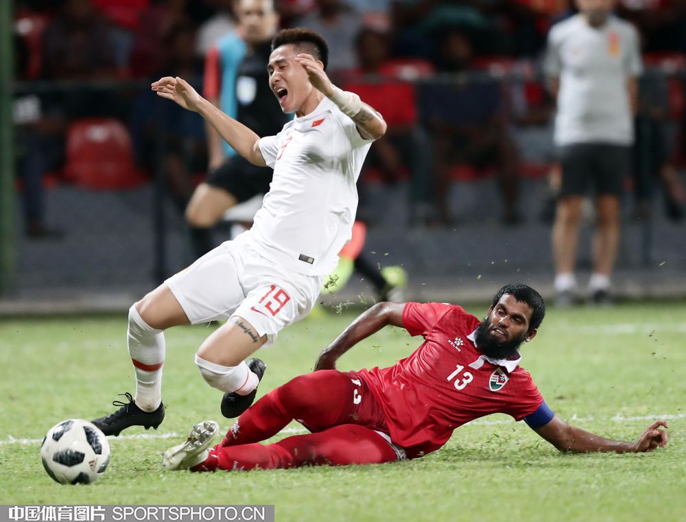 当地时间9月10日,2022年卡塔尔世界杯预选赛亚洲区40强赛中国队客战马尔代夫队的比赛在马尔代夫马累国家体育场举行。结果,中国队以5比0战胜对手,取得开门红。图为韦世豪强行突破被阿卜杜勒·加尼铲倒赢得点球的瞬间。(王宪民 摄)