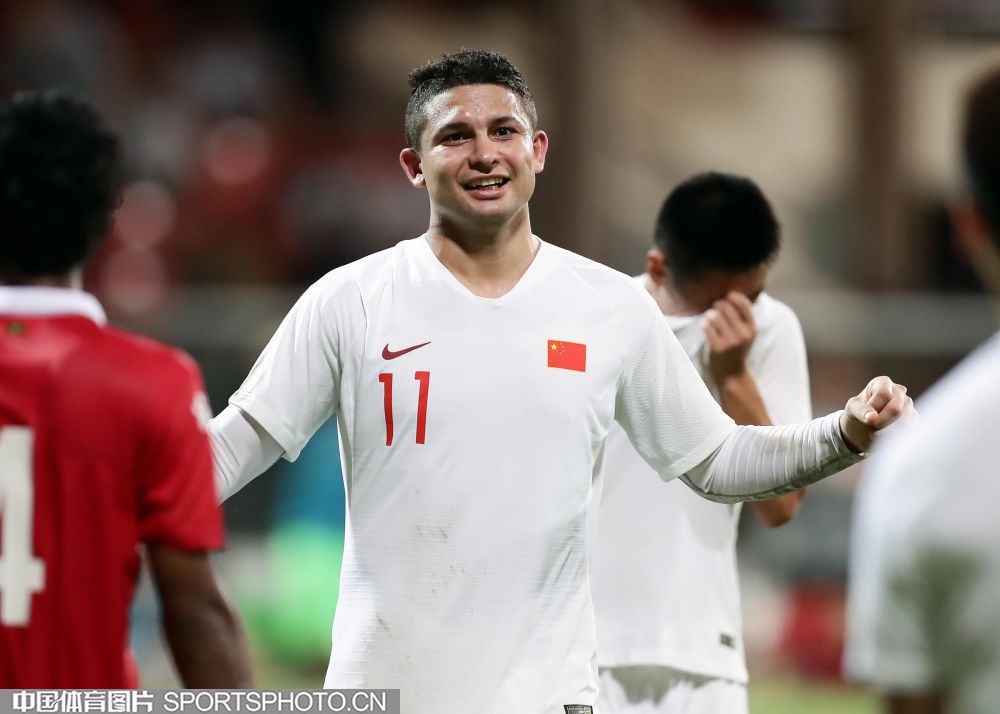 当地时间9月10日,2022年卡塔尔世界杯预选赛亚洲区40强赛中国队客战马尔代夫队的比赛在马尔代夫马累国家体育场举行。结果,中国队以5比0战胜对手,取得开门红。图为艾克森庆祝自己再下一城。 (王宪民 摄)