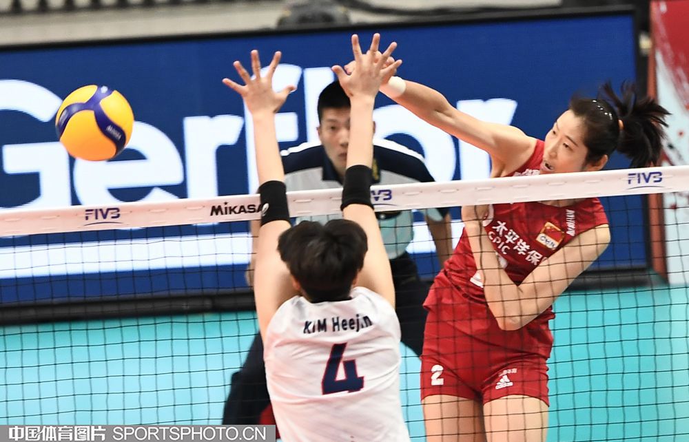 9月14日,2019女排世界杯在日本开始第一阶段小组赛。在首轮对阵韩国队的比赛中,中国队(红衣)以3:0(25:21、25:15、25:14)战胜韩国队(白衣),取得开门红。图为朱婷重扣。