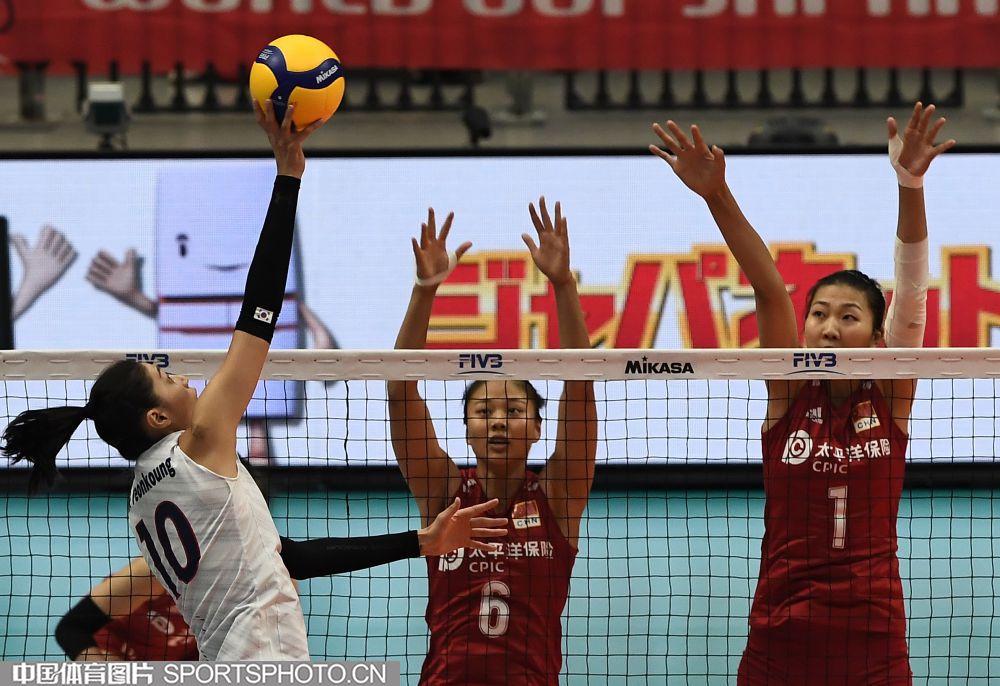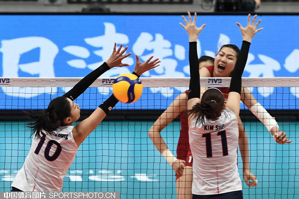 9月14日,2019女排世界杯在日本开始第一阶段小组赛。在首轮对阵韩国队的比赛中,中国队(红衣)以3:0(25:21、25:15、25:14)战胜韩国队(白衣),取得开门红。图为金软景(左)扣球,袁心玥(右)、龚翔宇双人拦网。