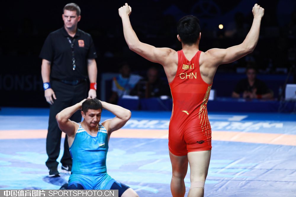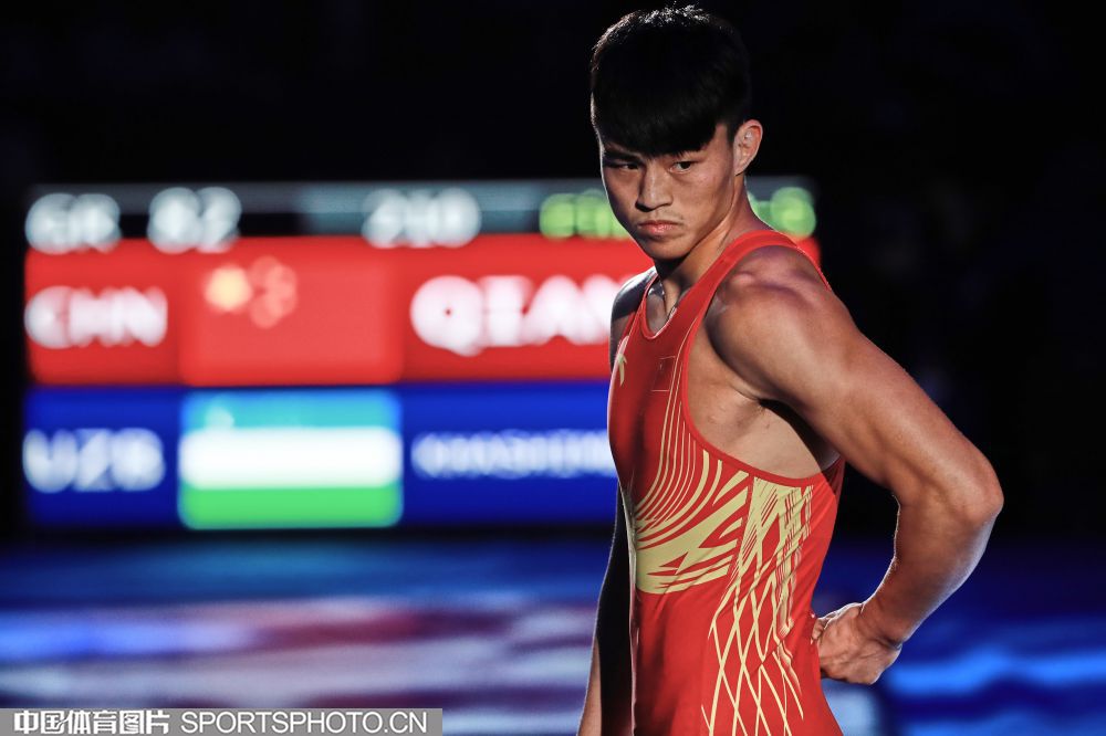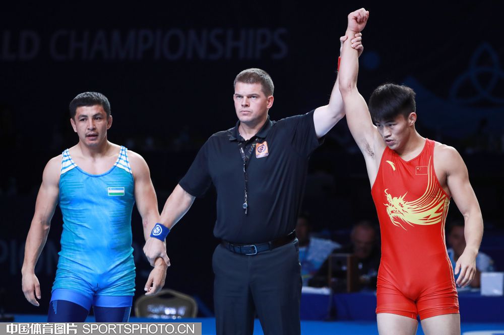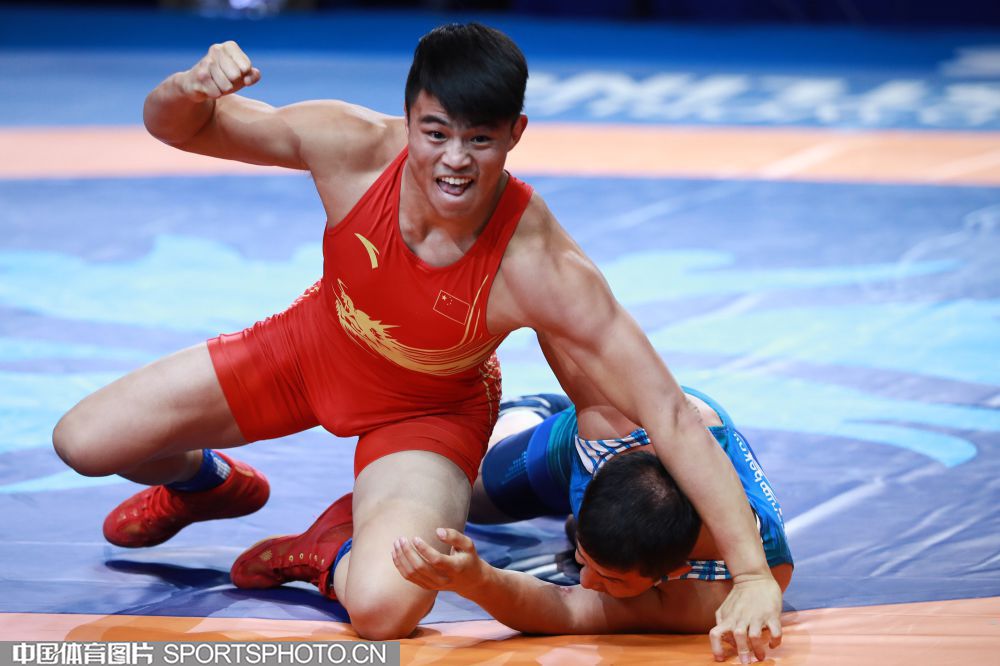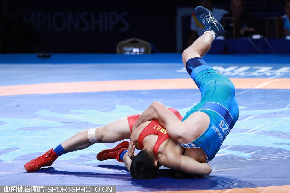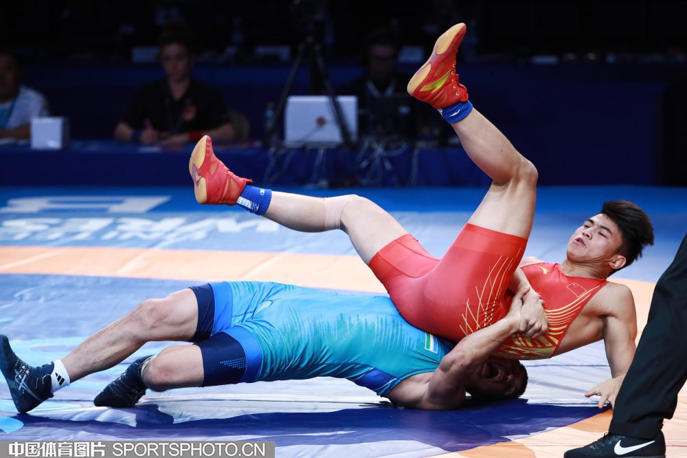 2019年9月15日,在哈萨克斯坦举办的2019世界摔跤锦标赛上,我国选手钱海涛在男子古典式摔跤82公斤级铜牌赛中战胜乌兹别克斯坦选手收获季军。(中国体育图片 鹿麟 摄)