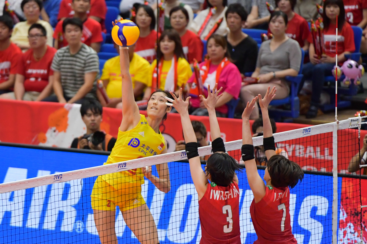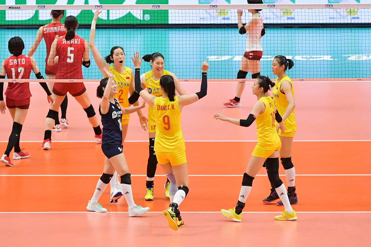 2019年女排世界杯赛第一阶段A组循环赛比赛中,中国队以3比0战胜日本队获得本届世界杯五连胜。(新华社 朱炜 摄)