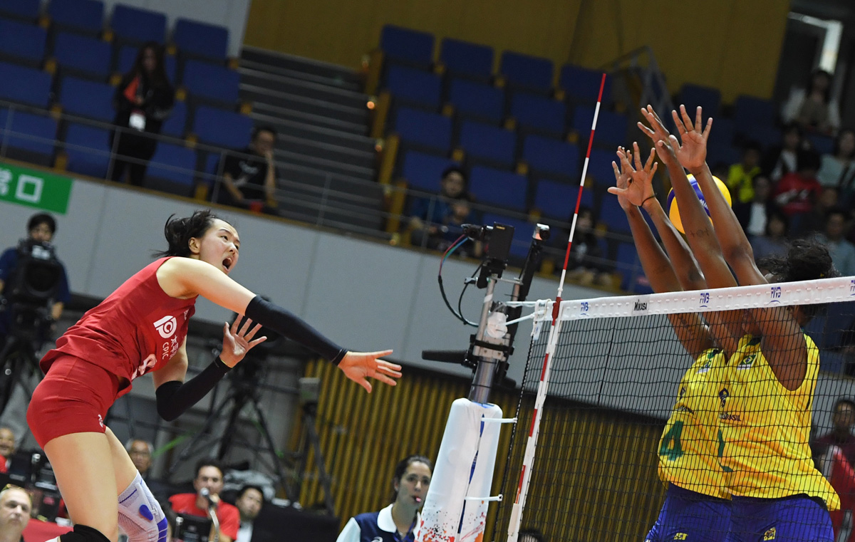 2019年女排世界杯赛第二阶段A组循环赛中,中国队以3比2战胜巴西队获得本届世界杯六连胜。(新华社 杜潇逸 摄)