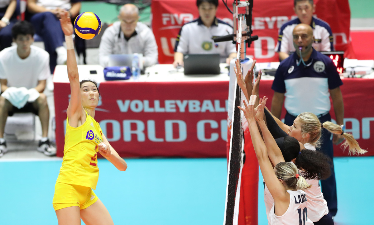 2019年女排世界杯赛第二阶段A组循环赛中,中国队以3比0战胜美国队获得本届世界杯七连胜。(新华社 杜潇逸 摄)