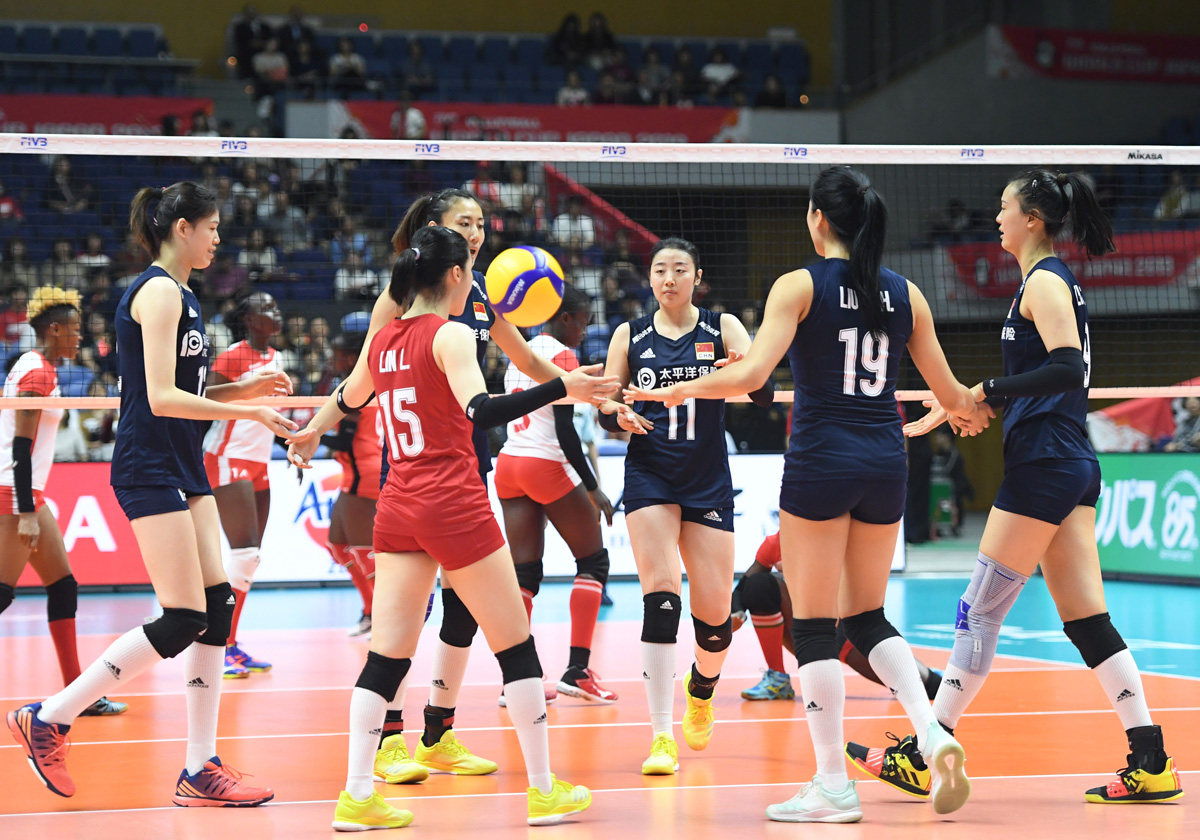 2019年女排世界杯赛第二阶段A组循环赛中,中国队以3比0战胜肯尼亚队获得本届世界杯八连胜。(新华社 贺灿铃 摄)