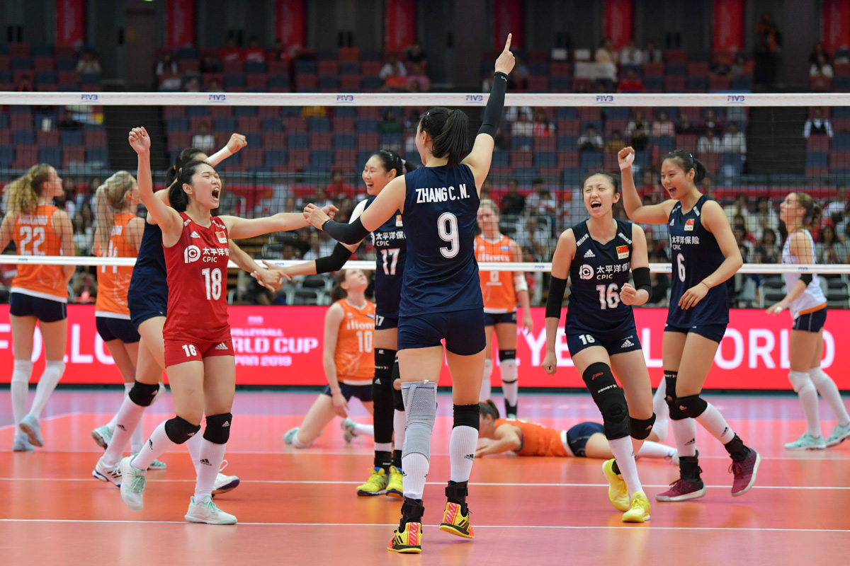 2019年女排世界杯赛第三阶段A组循环赛中,中国队以3比1战胜荷兰队获得本届世界杯九连胜。(新华社 杜潇逸 摄)