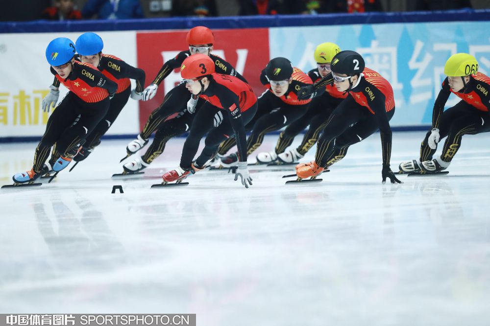 10月9日,“泰山体育杯”短道速滑国家队直通国际比赛选拔赛总决赛在北京首钢园短道速滑馆收官。当日进行了男、女1000米、3000米和女子3000米、男子5000米接力项目的决赛。图为男子5000米接力决赛场景。(鹿麟 摄)