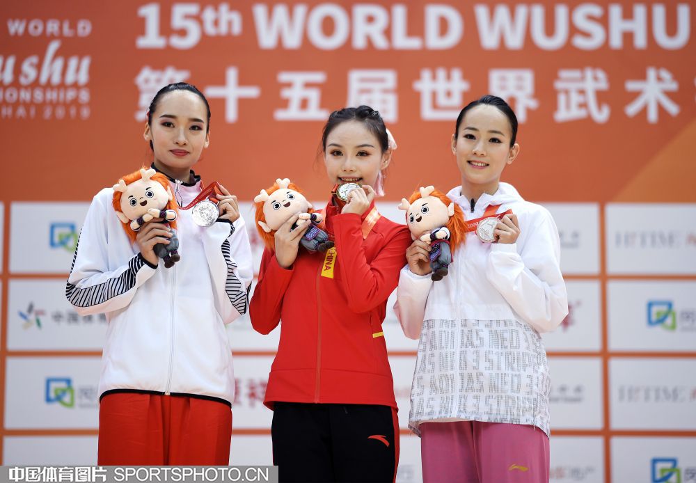10月22日,第十五届武术世锦赛在上海市闵行区体育馆继续进行。在女子太极拳项目中,中国选手梁壁荧以9.720分获得该项目冠军。图为梁壁荧(中)在颁奖仪式上。(倪敏哲 摄)