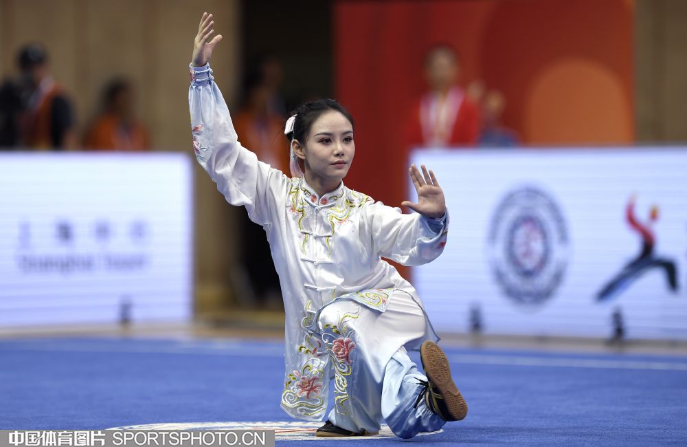 10月22日,第十五届武术世锦赛在上海市闵行区体育馆继续进行。在女子太极拳项目中,中国选手梁壁荧以9.720分获得该项目冠军。图为梁壁荧在比赛中。(倪敏哲 摄)