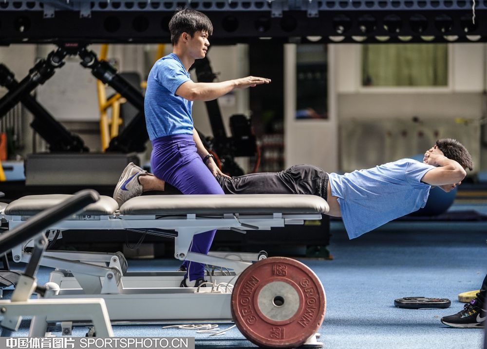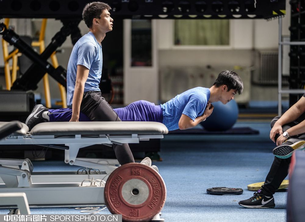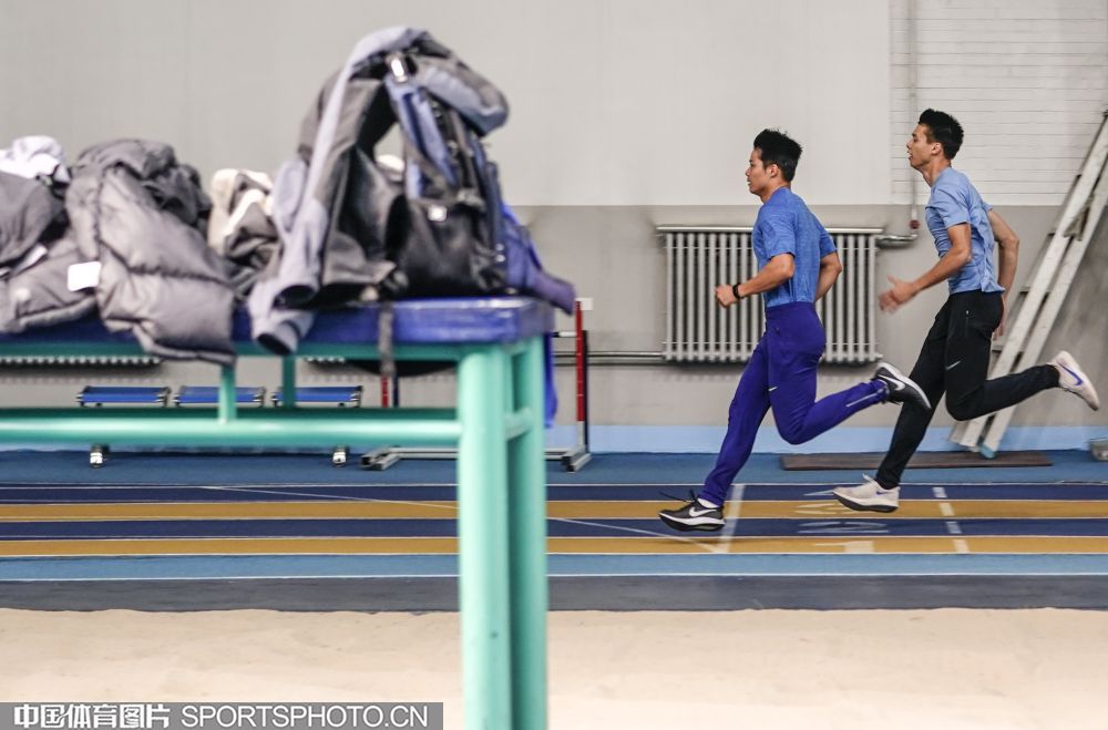 2019年10月28日,中国田径队部分队员在国家体育总局训练局田径馆进行训练。在本月初结束了多哈世锦赛后,中国田径队队员返回国内进行调整,备战2020东京奥运会。图为苏炳添(左)、梁劲生。(魏征 摄)