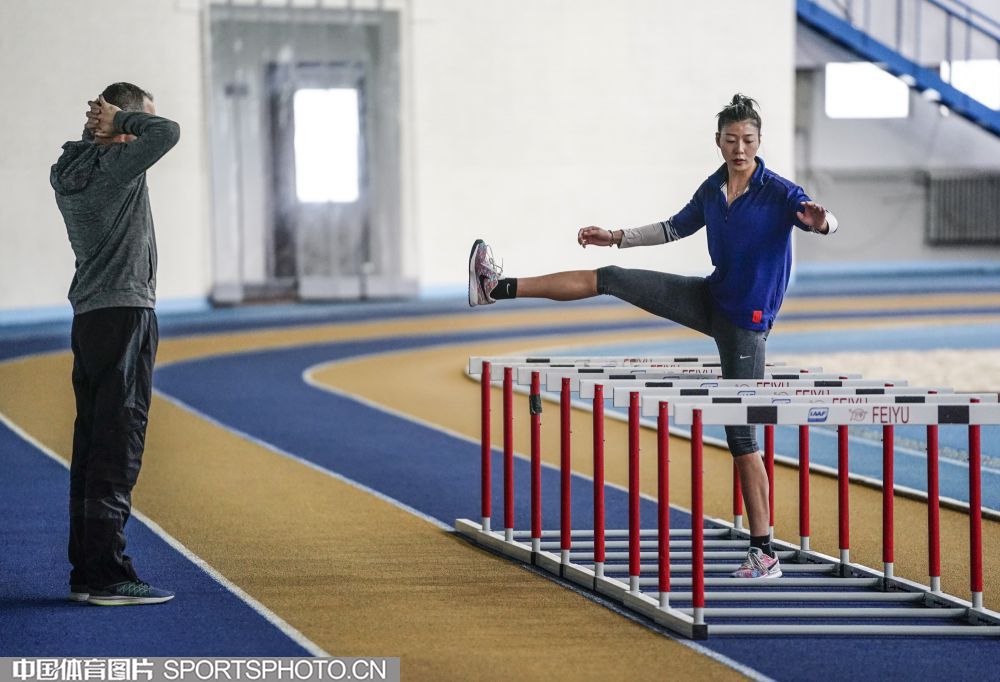 2019年10月28日,中国田径队部分队员在国家体育总局训练局田径馆进行训练。在本月初结束了多哈世锦赛后,中国田径队队员返回国内进行调整,备战2020东京奥运会。图为徐惠琴(右)。(魏征 摄)
