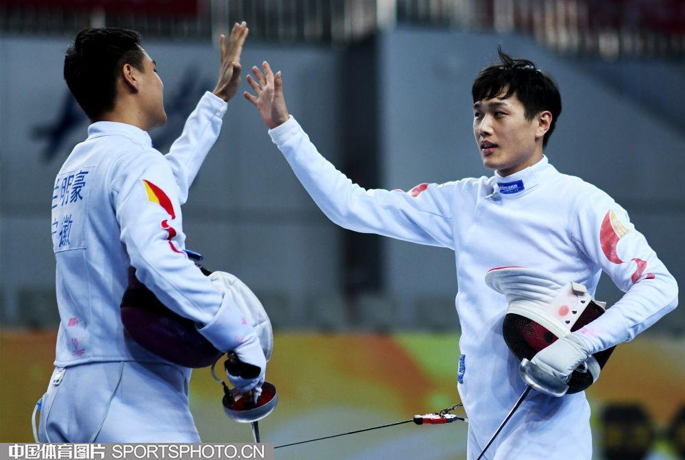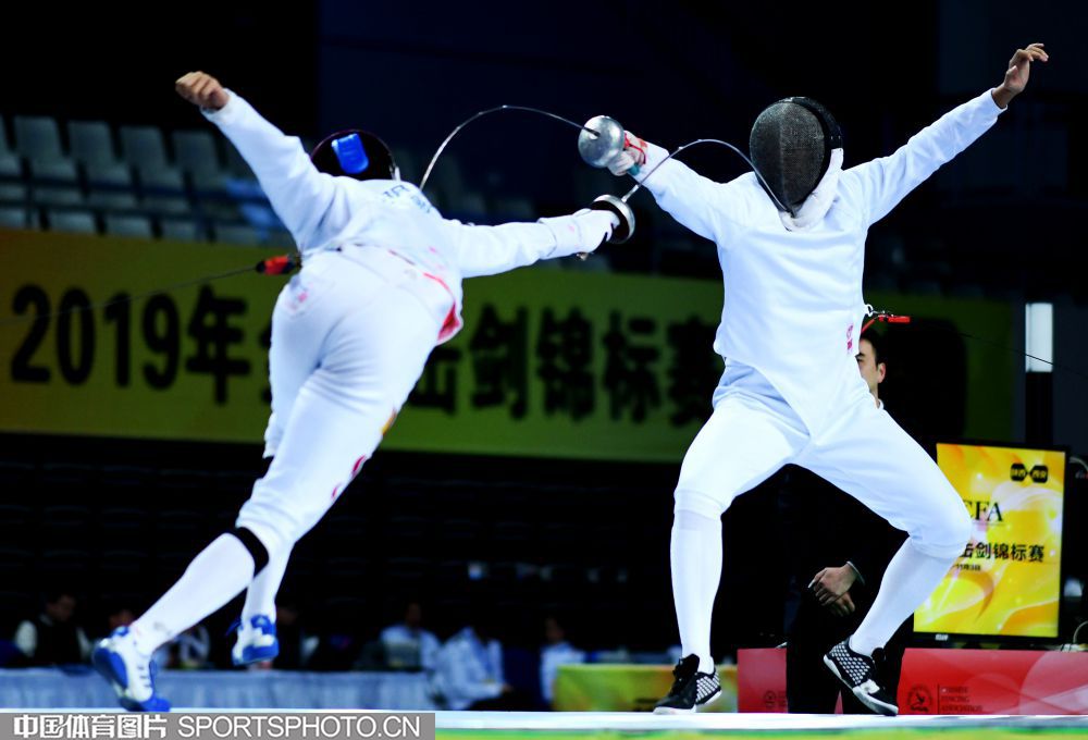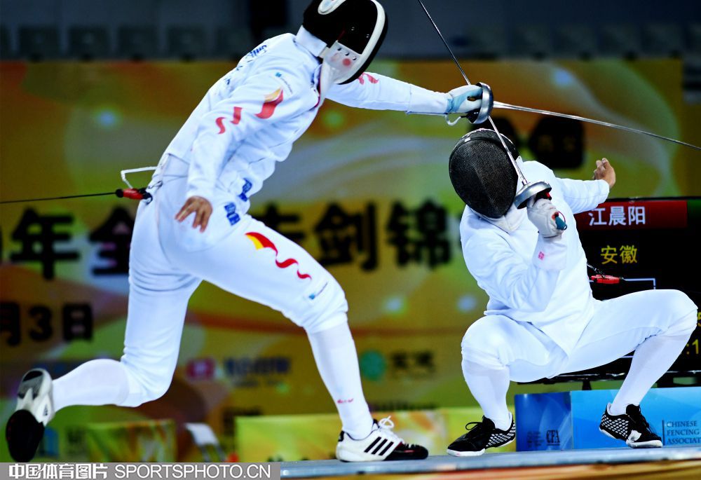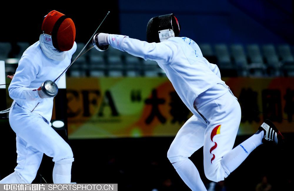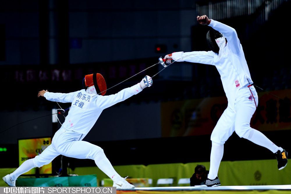 10月30日,2019全国击剑锦标赛在西安继续进行,男子重剑团体决赛中,安徽队以45比34战胜上海队夺得冠军。图为比赛现场。(倪敏哲 摄)