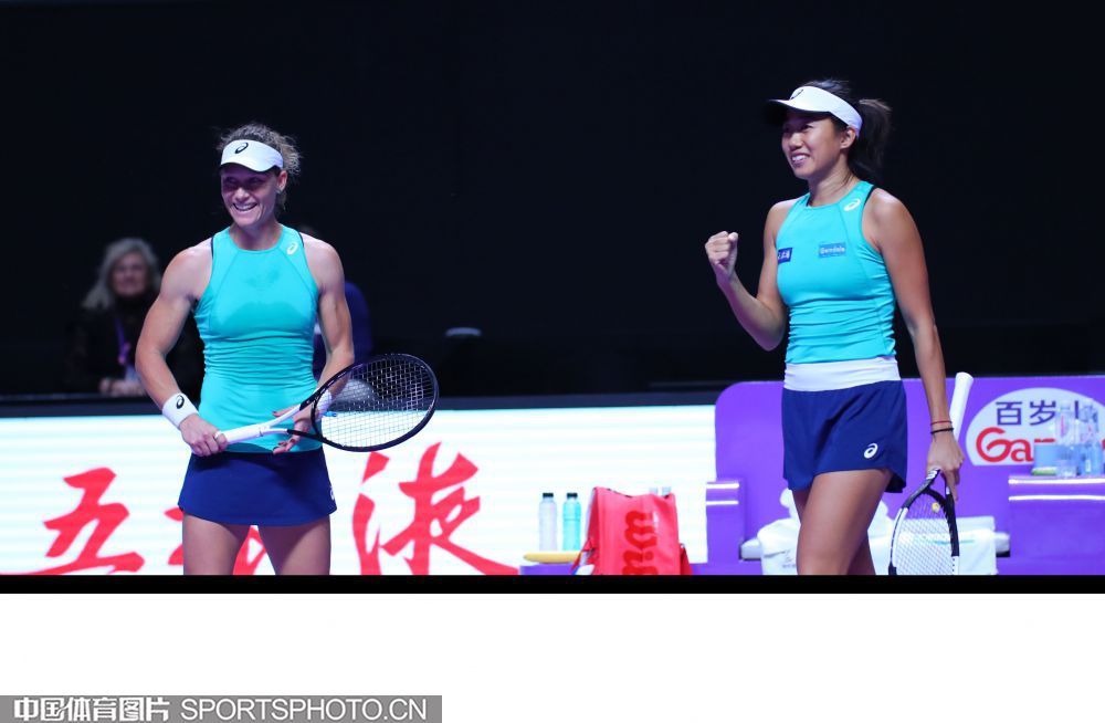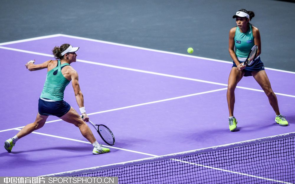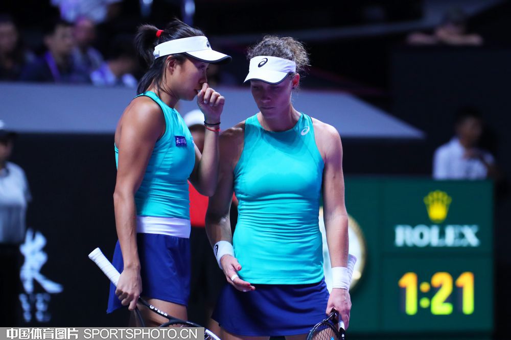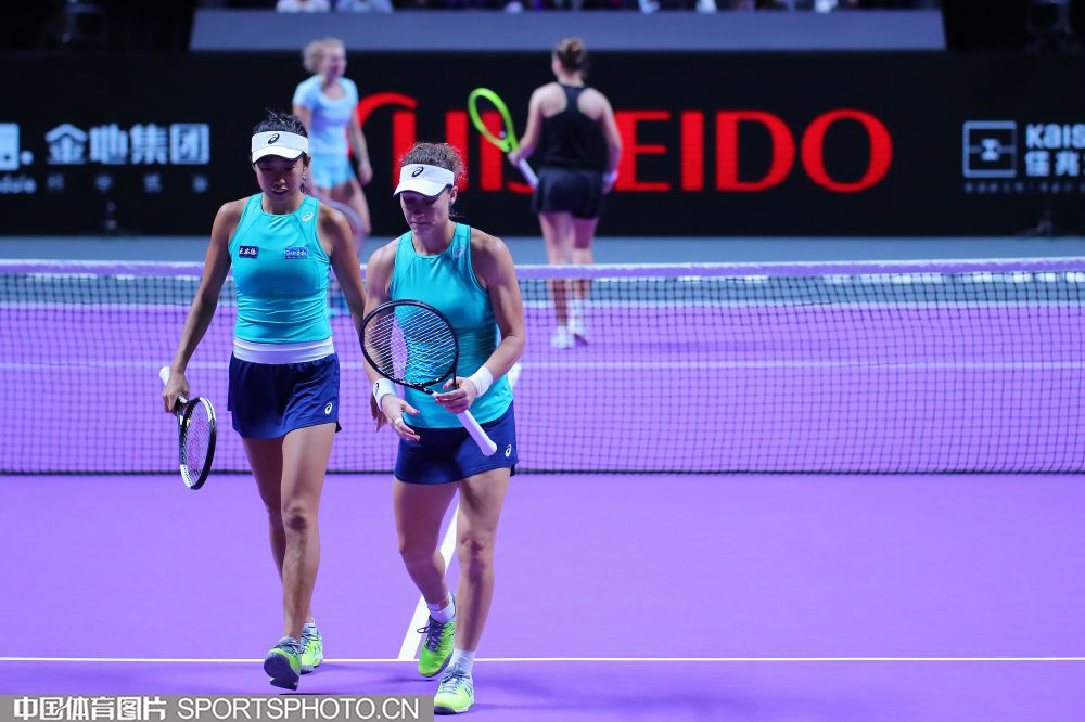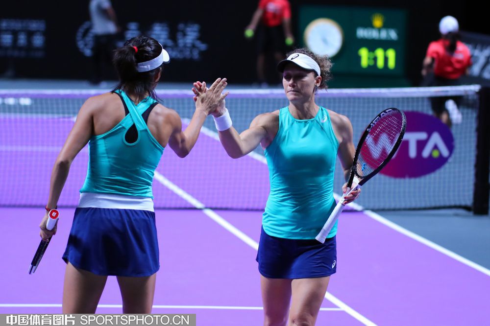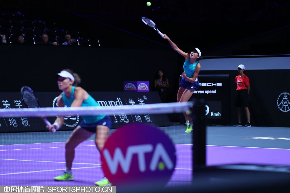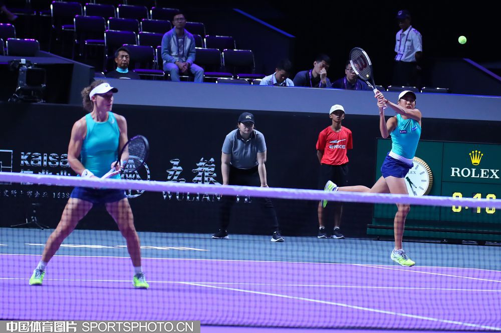 10月31日,2019深圳WTA年终总决赛展开第五个比赛日争夺,在双打比赛中,张帅/斯托瑟组合以2比0战胜捷克组合克赖奇科娃/西尼亚科娃。图为张帅/斯托瑟在比赛中。(高峡 摄)