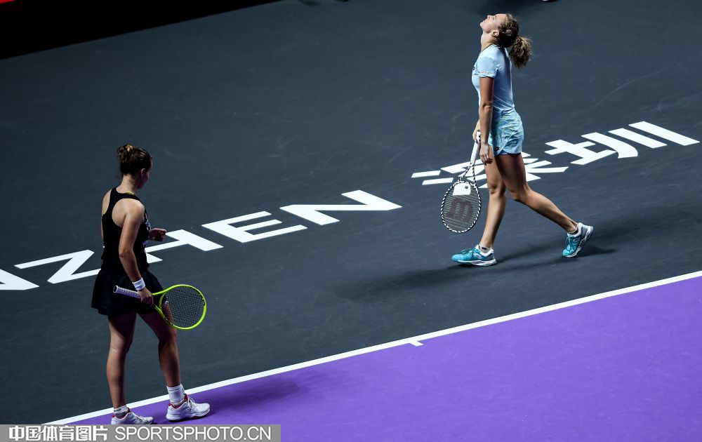 10月31日,2019深圳WTA年终总决赛展开第五个比赛日争夺,在双打比赛中,张帅/斯托瑟组合以2比0战胜捷克组合克赖奇科娃/西尼亚科娃。图为克赖奇科娃/西尼亚科娃 在比赛中。(高峡 摄)