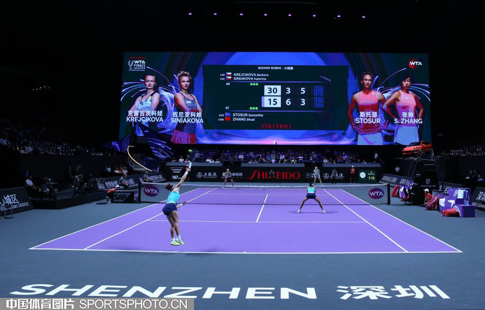 10月31日,2019深圳WTA年终总决赛展开第五个比赛日争夺,在双打比赛中,张帅/斯托瑟组合以2比0战胜捷克组合克赖奇科娃/西尼亚科娃。图为比赛现场。(高峡 摄)