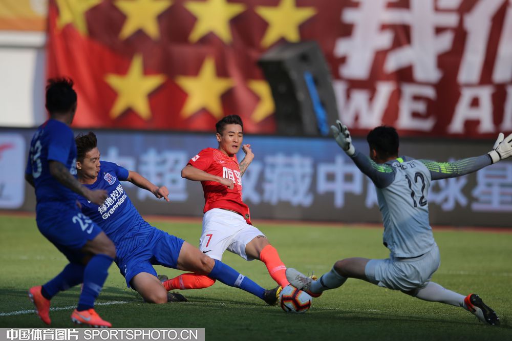 12月1日,在广州天河体育场进行的2019赛季中国足球协会超级联赛第30轮比赛中,广州恒大淘宝队主场以3比0战胜上海绿地申花队,第八次夺得中超冠军。图为广州恒大队韦世豪抢点射门得分。(中国体育图片 常州 摄)