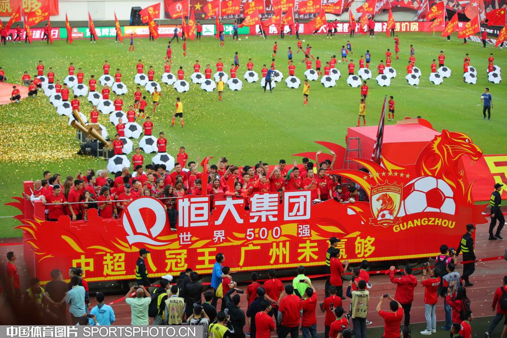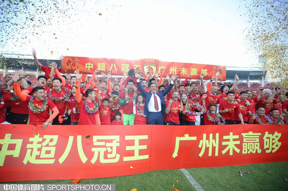 12月1日,在广州天河体育场进行的2019赛季中国足球协会超级联赛第30轮比赛中,广州恒大淘宝队主场以3比0战胜上海绿地申花队,第八次夺得中超冠军。图为赛后庆祝仪式。(中国体育图片 常州 摄)