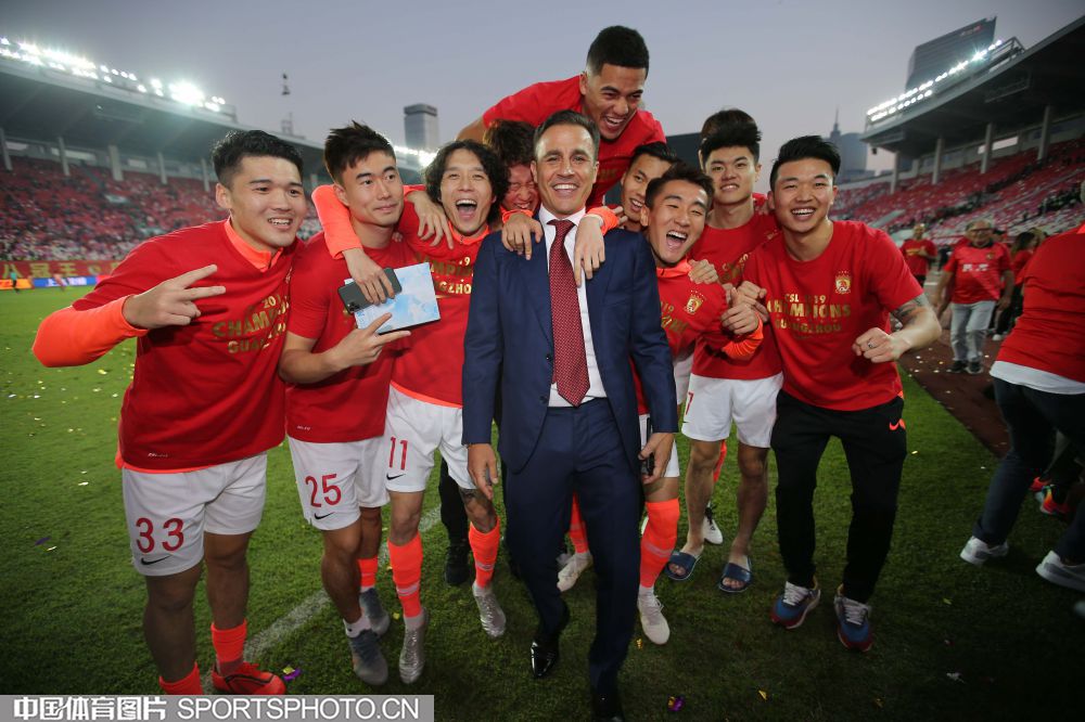 12月1日,在广州天河体育场进行的2019赛季中国足球协会超级联赛第30轮比赛中,广州恒大淘宝队主场以3比0战胜上海绿地申花队,第八次夺得中超冠军。图为广州恒大队主教练卡纳瓦罗与队员合影庆祝。(中国体育图片 常州 摄)