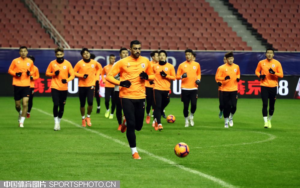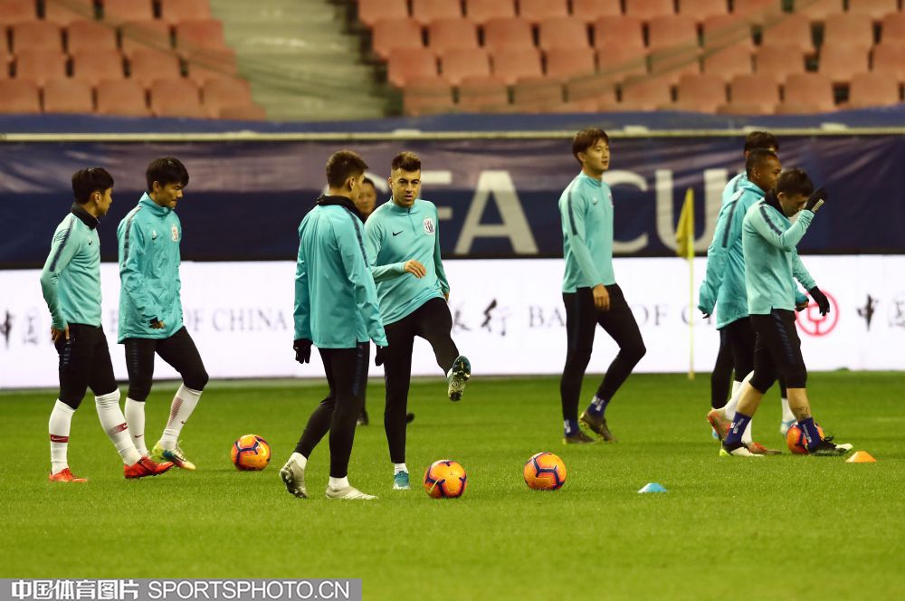 2019年中国足球协会杯决赛次回合将于12月6日打响,决战双方上海绿地申花和山东鲁能泰山5日分别在上海虹口足球场举行赛前新闻发布会并进行踩场训练。图为山东鲁能队队员踩场训练。(中国体育图片 王宪民 摄)