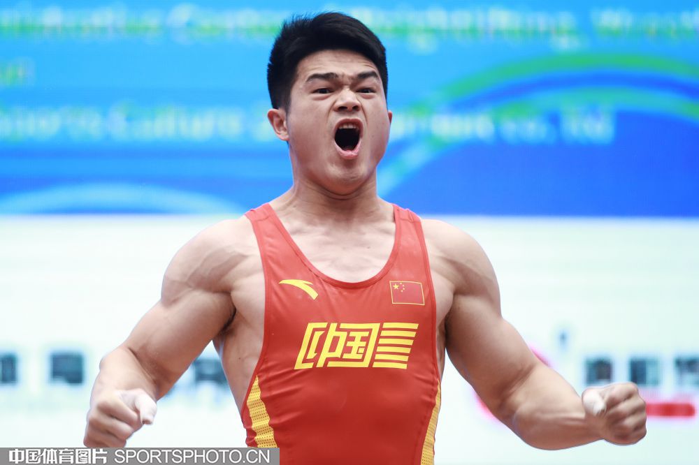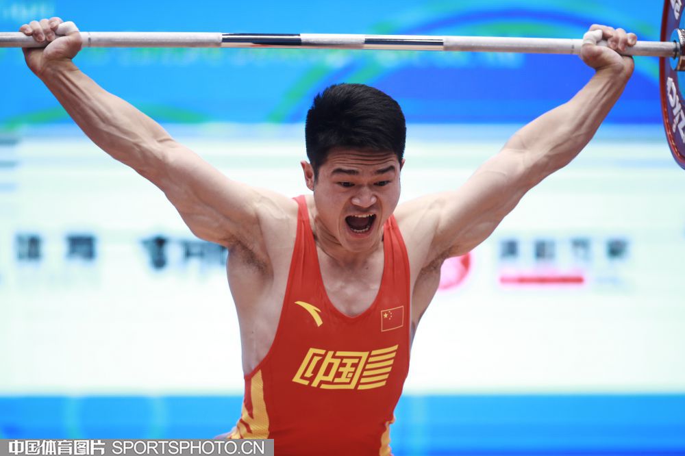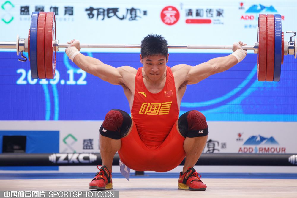 12月10日,2019年举重世界杯赛暨2020年东京奥运会资格赛第一比赛日在天津市人民体育馆举行。当天进行男子61公斤级、73公斤级、81公斤级和女子49公斤级等多项比赛。图为石智勇在男子73公斤级比赛中。 (中国体育图片 鹿麟 摄)