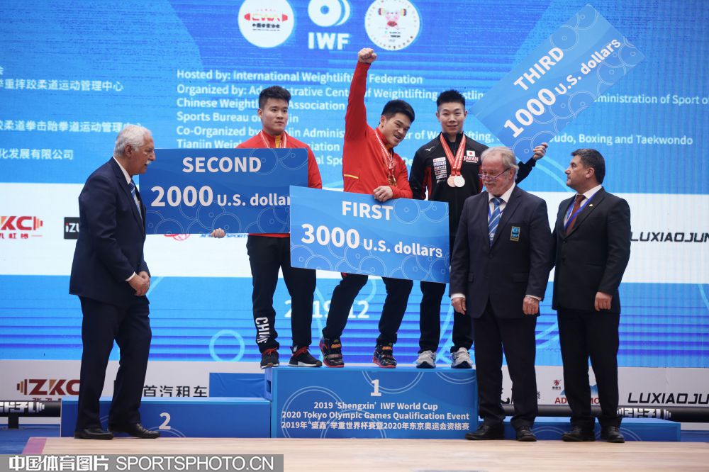 12月10日,2019年举重世界杯赛暨2020年东京奥运会资格赛第一比赛日在天津市人民体育馆举行。当天进行男子61公斤级、73公斤级、81公斤级和女子49公斤级等多项比赛。图为男子73公斤级冠军石智勇(中)在领奖台上。 (中国体育图片 鹿麟 摄)