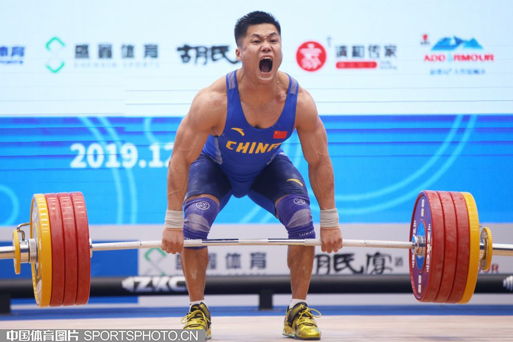 12月10日,2019年举重世界杯赛暨2020年东京奥运会资格赛第一比赛日在天津市人民体育馆举行。当天进行男子61公斤级、73公斤级、81公斤级和女子49公斤级等多项比赛。图为吕小军在男子81公斤级比赛中。 (中国体育图片 鹿麟 摄)
