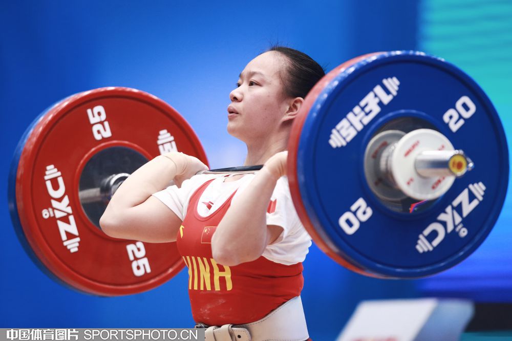12月10日,2019年举重世界杯赛暨2020年东京奥运会资格赛第一比赛日在天津市人民体育馆举行。当天进行男子61公斤级、73公斤级、81公斤级和女子49公斤级等多项比赛。图为蒋惠花在女子49公斤级比赛中。 (中国体育图片 鹿麟 摄)